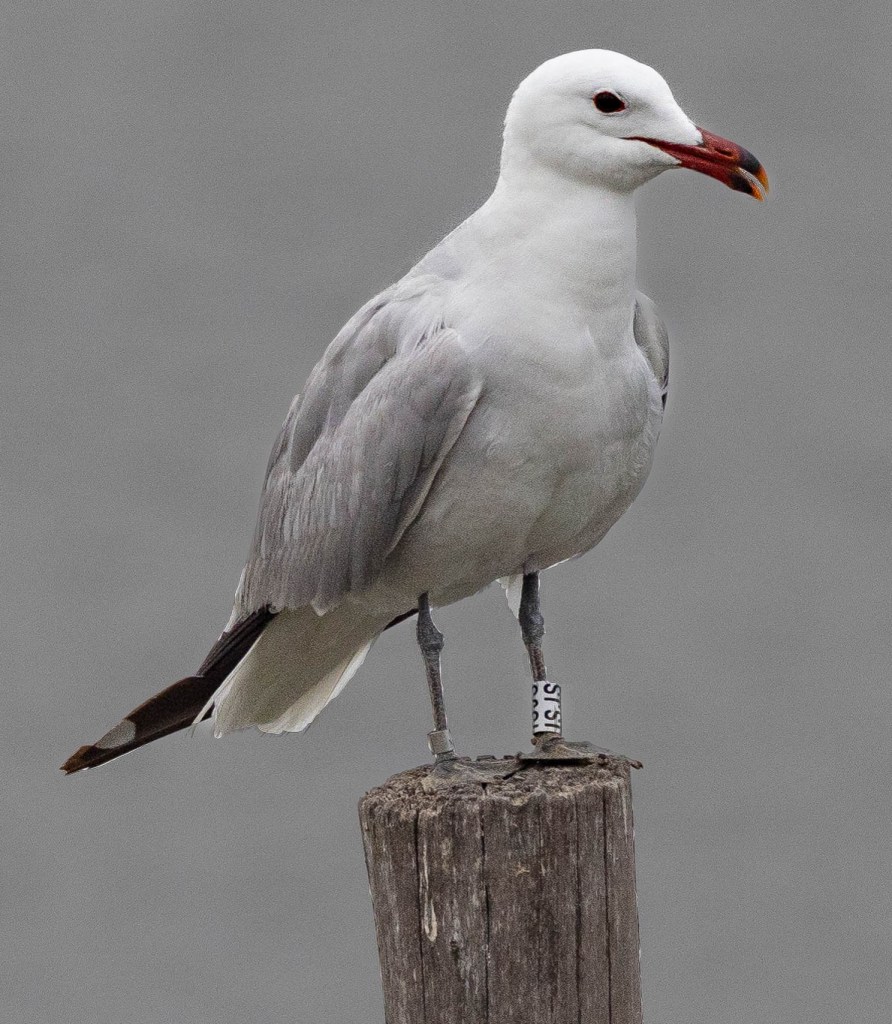 The Audouin’s Gull has a fairly restricted range, including some parts of the Mediterranean, and the noth west African coast, distinguished by the red bill and grey legs.